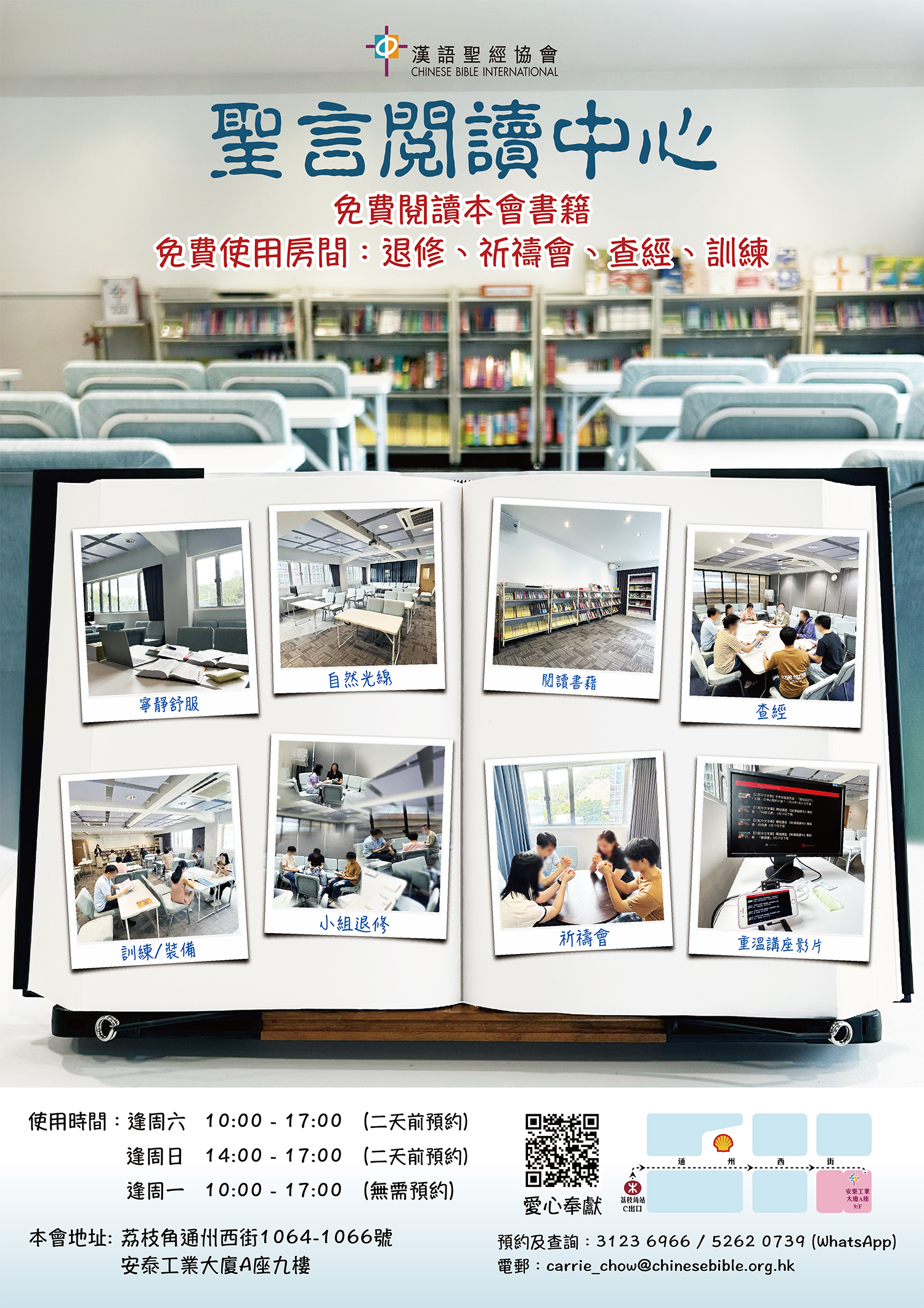 聖言閱讀中心/借用場地查詢及申請電話:3123 6966